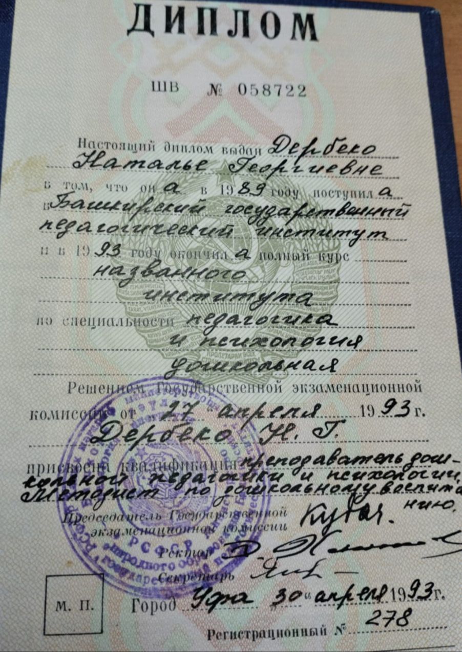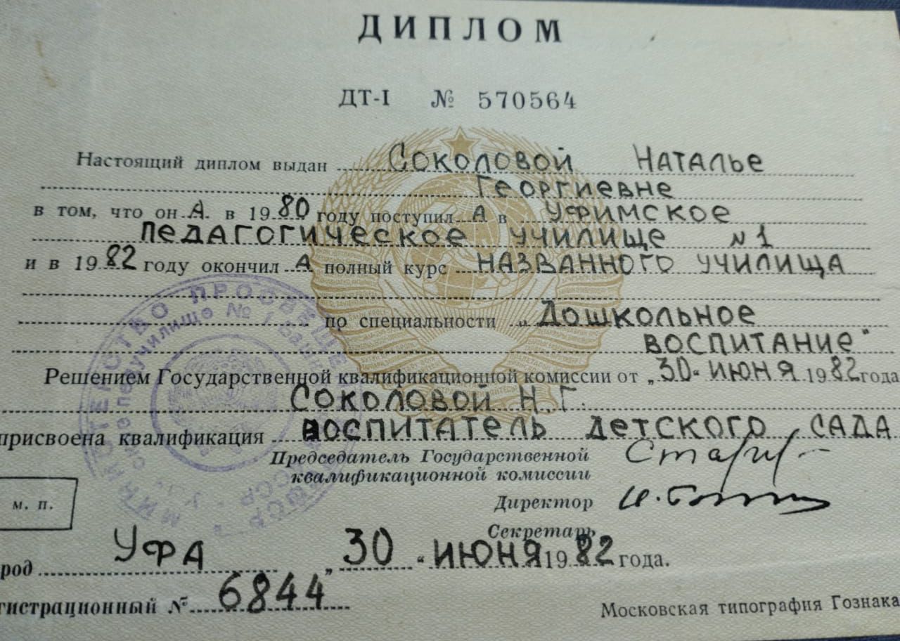 Уфимский пед. колледж Воспитатель 1982г