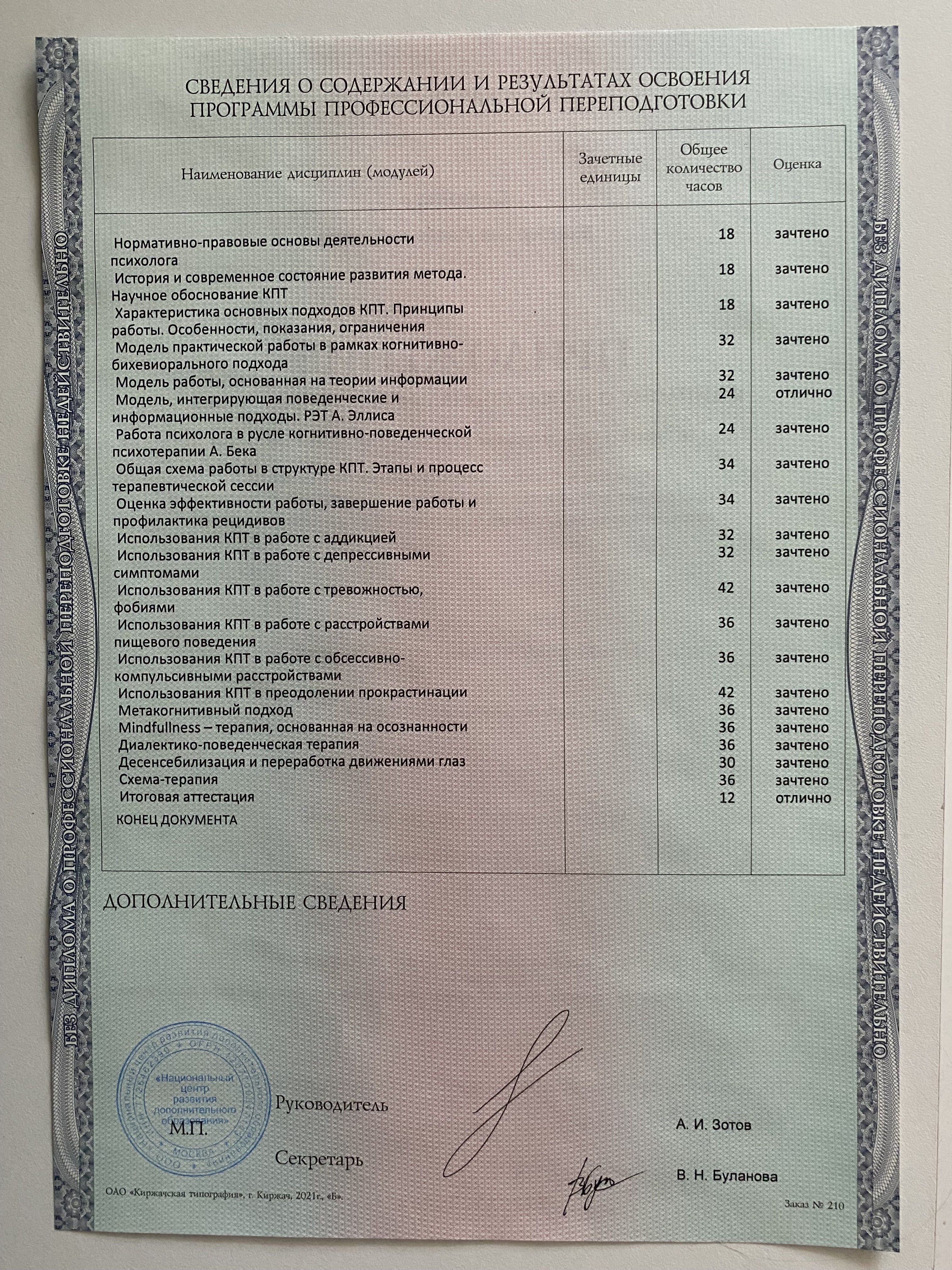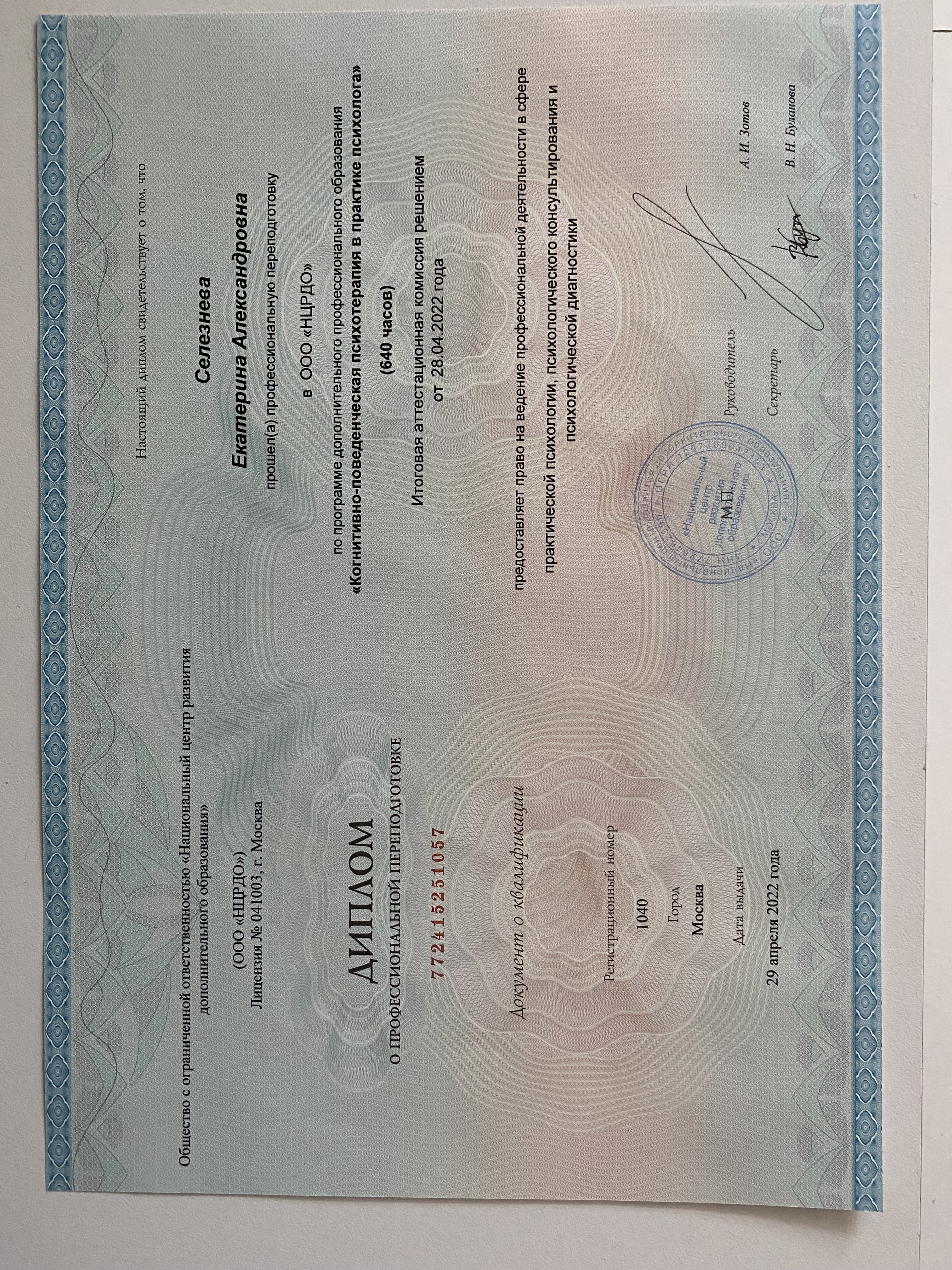 Национальный центр развития дополнительного образования. Специализация "Когнитивно-поведенческая терапия в практике психолога", 640 часов, 2022 год